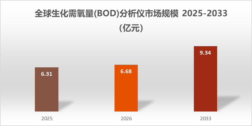 根据问可汇(WENKH)深度研究分析,全球水环境治理与排放管控力度不断提升推动生化需氧量分析仪市场持续增长。各国对水体质量与污水处理的监管要求持续提高,BOD作为关键水质监测指标被广泛纳入合规体系,下业为满足管控标准,持续加大监测设备的部署与更新力度,形成市场长期增长的核心动力。2026年全球生化需氧量 (BOD) 分析仪的市场规模达到7亿元。未来预计以4.92%的年复合增长率增长至2033年的9亿元。